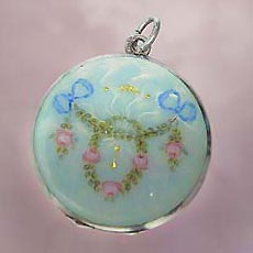 美しいギョシェ彫りに淡いブルーが美しいロケット。ブルーの地に描かれたゴールドのドットとバラのガーランドが上品な雰囲気です。