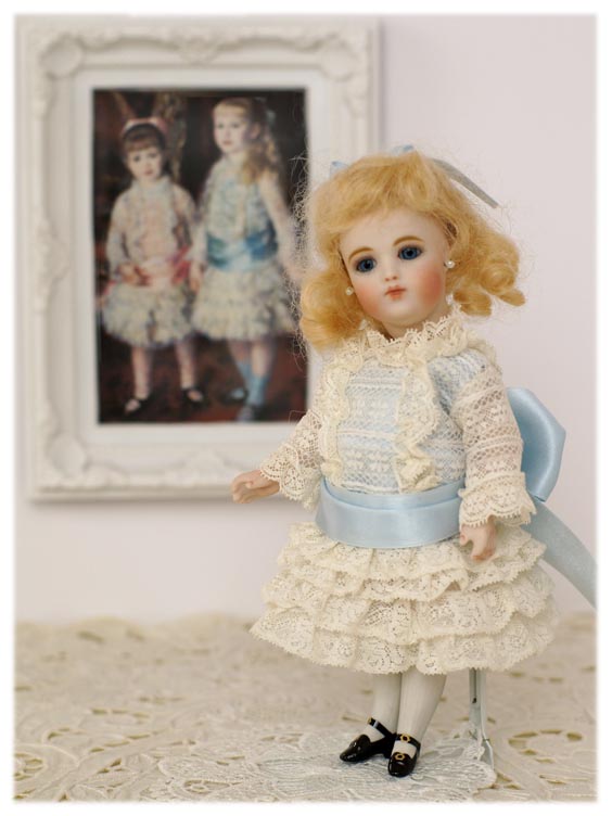 深いブルーのドレスにレース飾り、赤いリボン。ルノワールの絵画「じょうろを持つ少女」の世界観をビスクドールで再現しました。