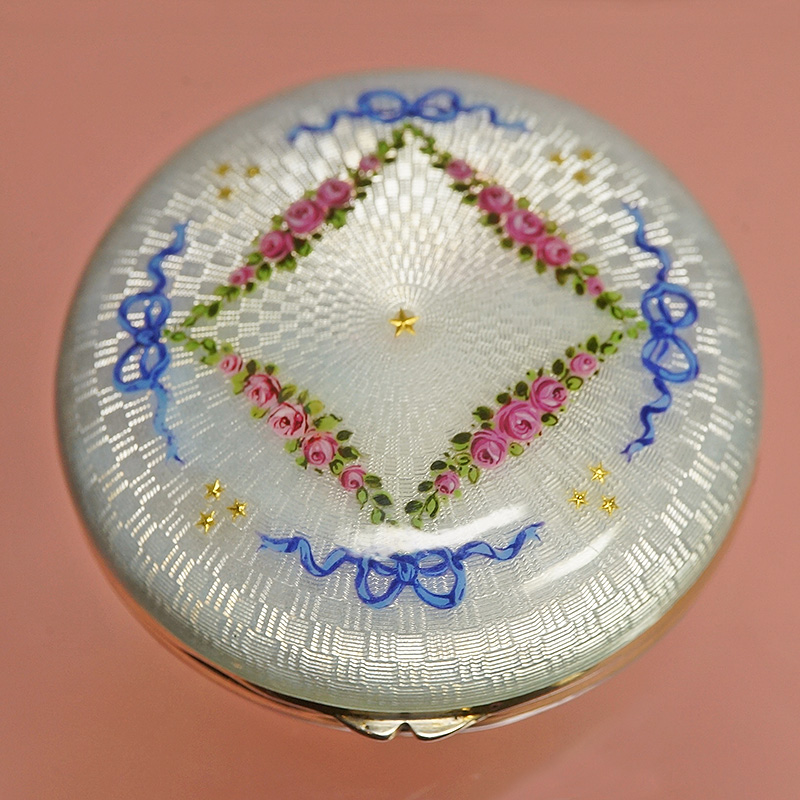 ターンの繊細な地模様。その地模様は通常の放射状ではなく、市松模様を思わせる放射状の細工。その上に透明感のあるホワイトのエナメルをかけたギョシェエナメルです。さらにその上にブルーのリボンと「豊穣の印」の薔薇のガーランドをハンドペイント、中央には金箔をあしらった星形、リボンとリボンの間にも同様の小さな三つの星形が細工されています。気付け薬を入れる「ピルケース」と表記させていただきましたが、フランスではこうしたエナメルボックスのことを