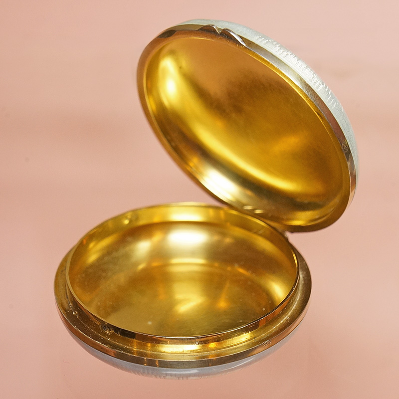 エナメルのガラス質の冷たさと、艶やかでしっとりとした質感が魅力的。しっかりした重みがあります。ふただけでなく、本体もギョシェの細工が施されていて、底部分のみシルバーの地金のままの作りです。また、本体、ふたの内側は、中に入れた物が酸化しないよう、シルバーにゴールドを張ったヴェルメイユ。当