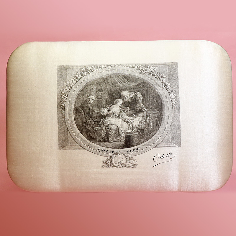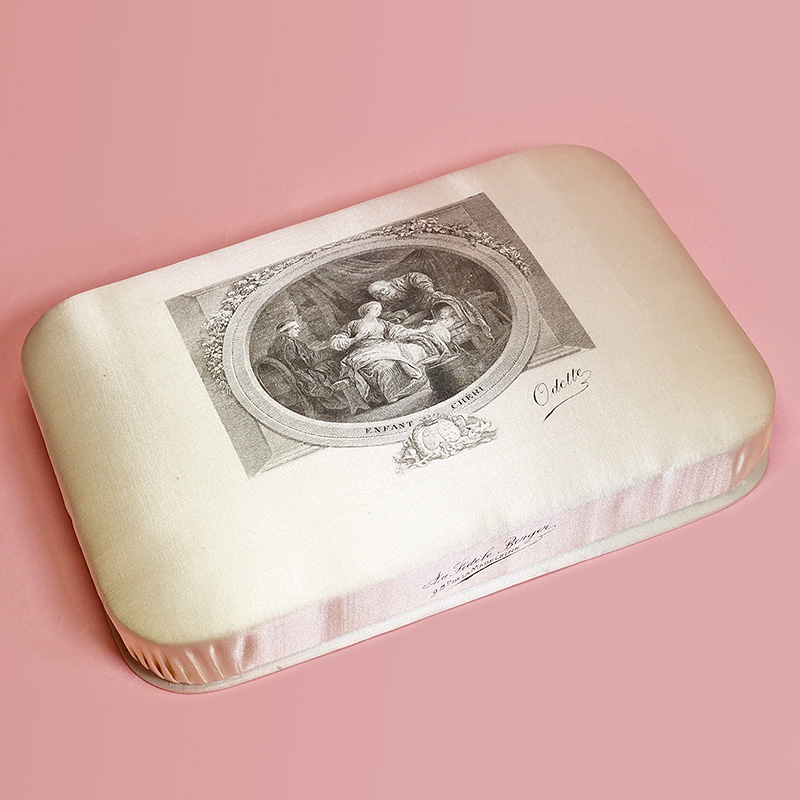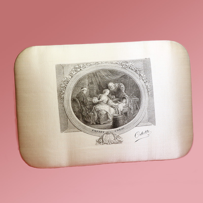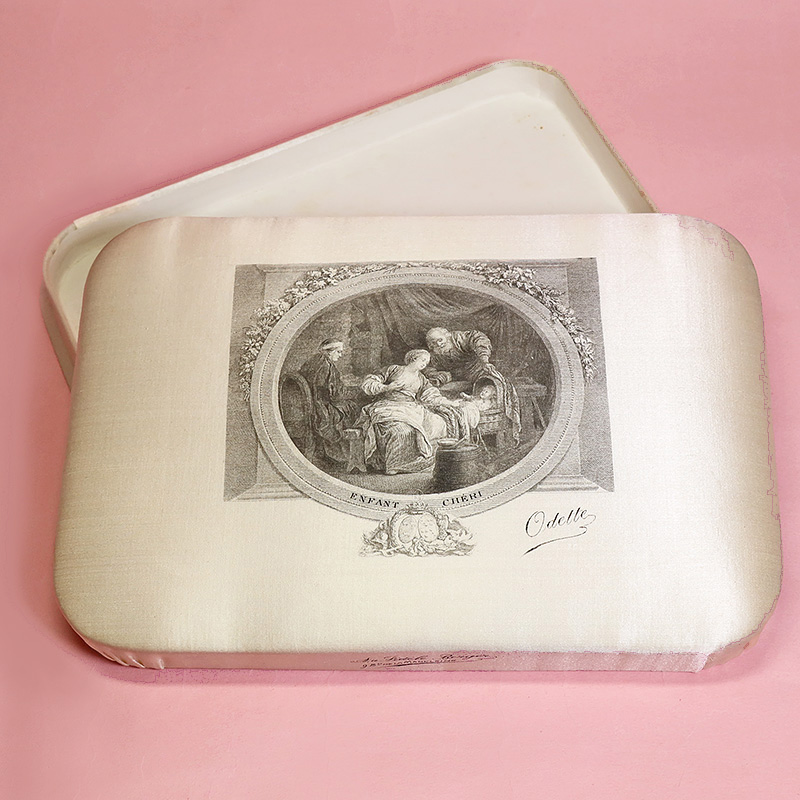 洗礼式用のチョコレートボックスの中でも豪華なシルク製。ブルジョワのおうちの子供のために誂えられたと思われるボックスです。シルク地にエッチングで印刷されています。