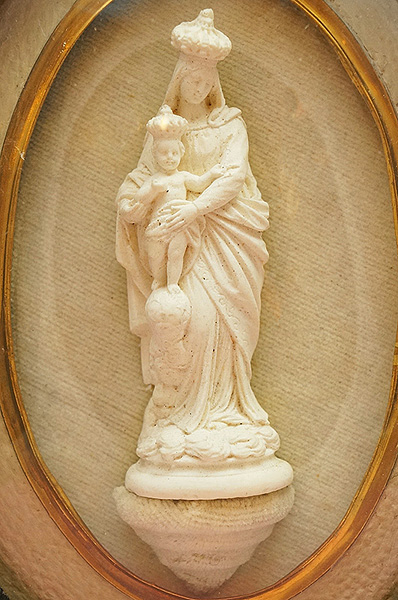 吹きガラスによるハンドメイドの球面ガラスのはまったオーバルのフレームの中には、幼子イエスを抱いた優しい表情のマリア像。礼拝の場に飾ったと思われるカトリックの国フランスらしい宗教的なアイテムです。