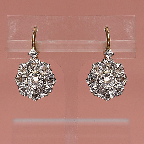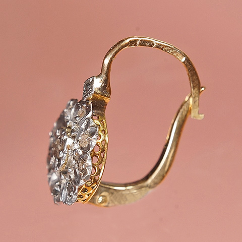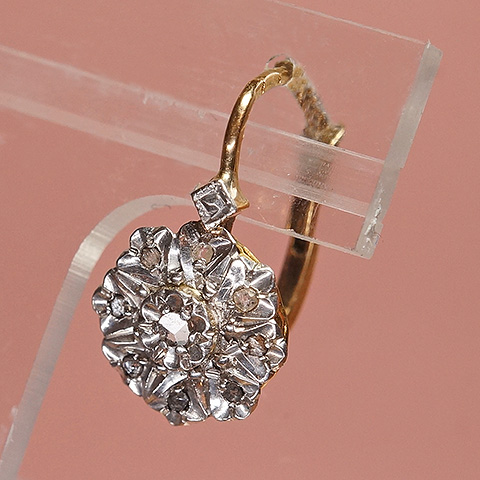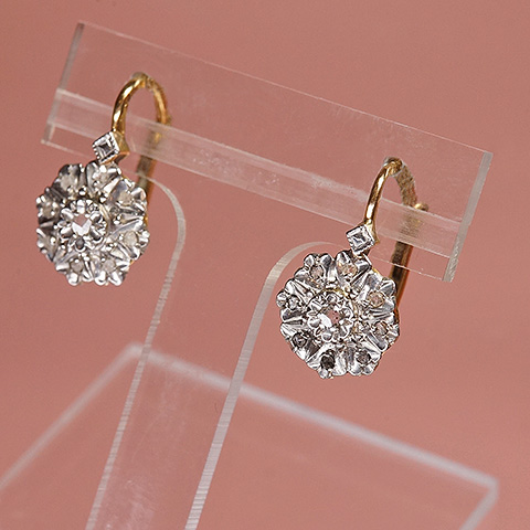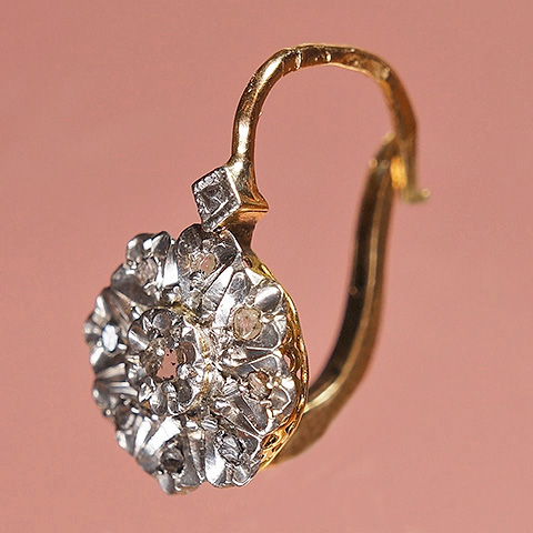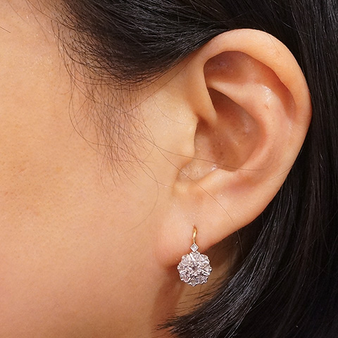 1石をセット、その周囲に8石のローズカットダイヤを取り巻いたお花形のクラスタースタイルのピアスです。中央のローズカットダイヤは花びら形に細工され