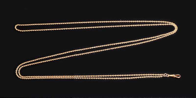 沢山のリング状のパーツをつなぎ、さらにそれをロープ状にねじったフレンチロープと呼ばれるゴールドチェーンです。ルーペでよく見るといくつもの丸カンが複雑につながっていることが分かります。沢山の地金を使っているため独特の素材感、重厚感があり、非常に滑らかな感触が特徴です。