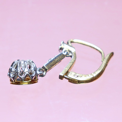 地金は18Kゴールドで、ピアス金具部分に、フランスで1838年から1919年まで使用された「ホースヘッド」の刻印があります。お花形の台座にも、長方形の台座にも、縁には繊細なミルグレインが施され、その緻密な仕事振りはアンティークならではです。一番上のお花形の台座、長方形の台座、一番下の台座の表側は、ダイヤの無色透明な色合いに合わせてホワイトゴールドが。それらの裏側とピアス金具はイエローゴールドのコンビになっています。