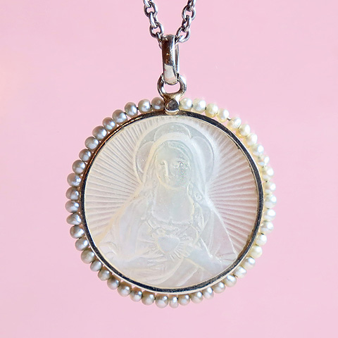 こちらはイギリスで買付けたジュエリーですが、メダイといえばカトリックのアイテム。ですので、他のヨーロッパのカトリック国から旅してきたものかもしれません。カトリック信者の方にも、そうでない方にも、「お護り」としてもおすすめです。