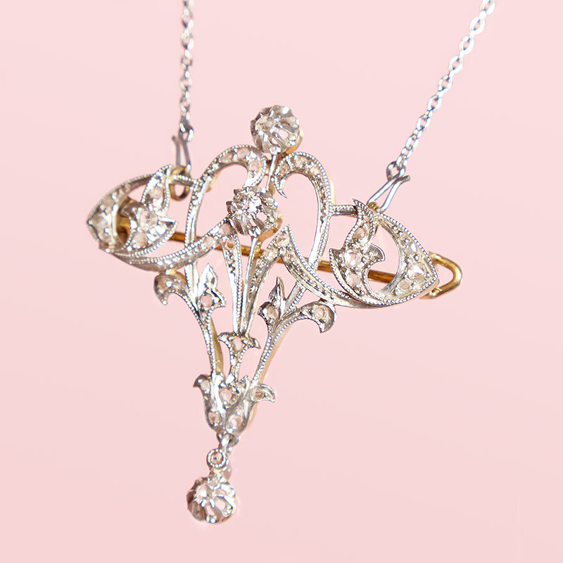 全部で39石、ダイヤを散りばめたアール・ヌーボーの2wayジュエリー