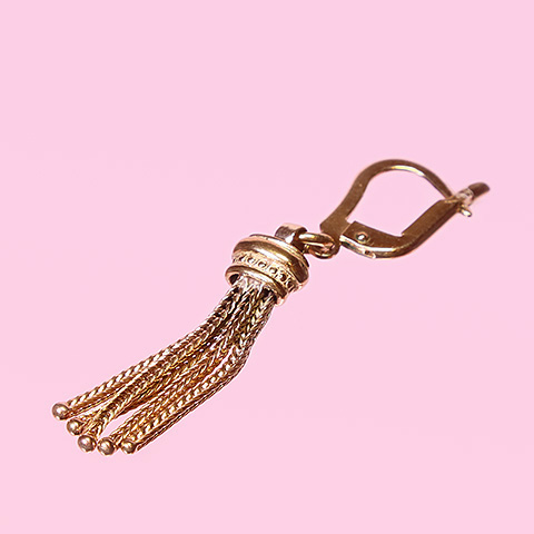 ピアス金具はストッパーの付いた上質な作り。刻印はありませんが、タッセル部分の地金は9Kのイエローゴールドで(専門の鑑別機関で鑑別済みです。)、ピアス金具は「9K」を意味する「375」の刻印と「ロンドン1936年製」らしき刻印があることから、後の時代に付けられた可能性があります。