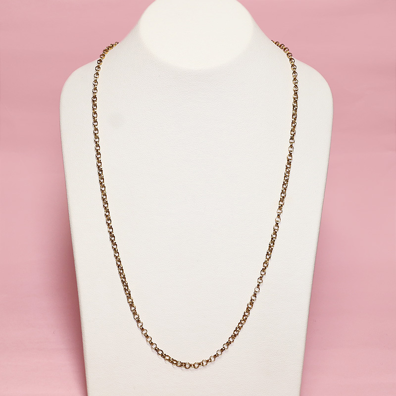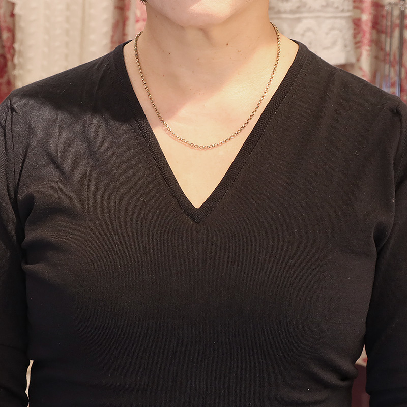 首にかけていただくと鎖骨の下にくるサイズで、このままチェーンだけ着けていただいたり、ペンダントトップやシールを提げていただくのにぴったりのゴールドチェーンです。