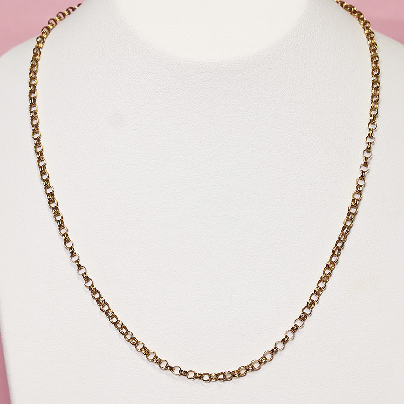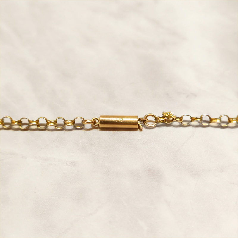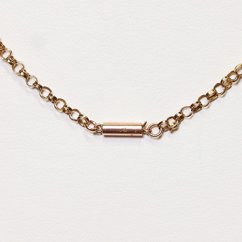 日本では「あずきチェーン」と呼ばれる丸いリング状のパーツが連なったケーブルチェーンです。ルーペで眺めると、リング状のパーツひとつひとつが凸状になっていて、テクスチャーが感じられます。