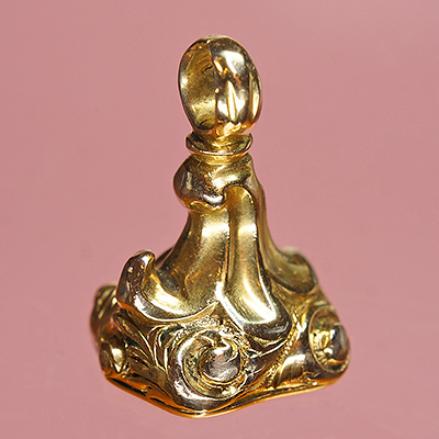 金属部分には、渦巻き模様の装飾の上から繊細な手彫り彫刻。ペーストのエンブレムのような形も特徴です。現在でもシーリングワックスに押すと錨とイニシャルがくっきり浮かび上がり、実際に押して楽しんでいただくことも出来ます。