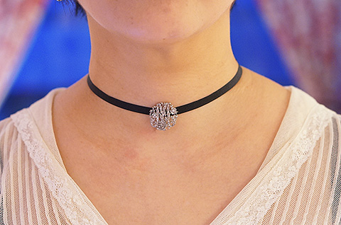 留めの部分にイーグルヘッドの刻印があります。元々はブローチですが、リボンに留めてチョーカーとしてお使いいただくのもおすすめ、フランスらしい華やか