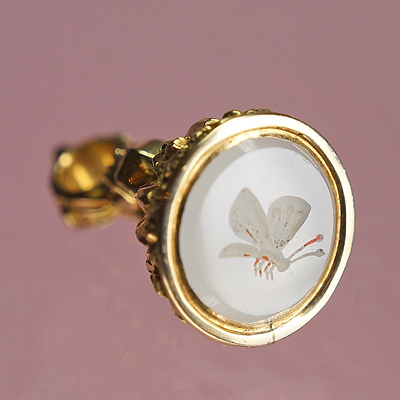 アゲートに蝶の陰刻、日本でも家紋などに使われている蝶の図柄ですが、キリスト教では「復活」を意味する紋章として、古来から愛されてきました。丸い形の金属部分いちめんに手彫り彫刻、薔薇模様の細工も施されています。