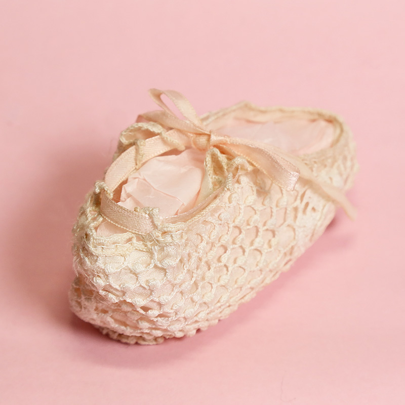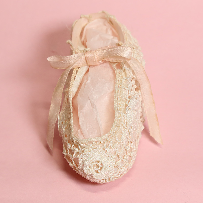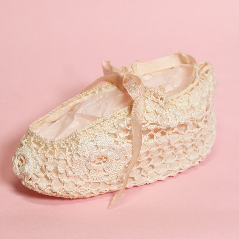 トウと左右には二重にもなった花びらの薔薇モチーフ、かかとにも薔薇モチーフが編み込まれた細い糸で編まれた繊細なアイリッシュクロシェのベビーシューズです。ピコットの付けられた細かい網目で、内側は薄いシルク張り。それぞれサイド二箇所を細いピンクのシルクリボンで結わえる仕様、ふんわりと赤ちゃんの足を包むファーストシューズです。