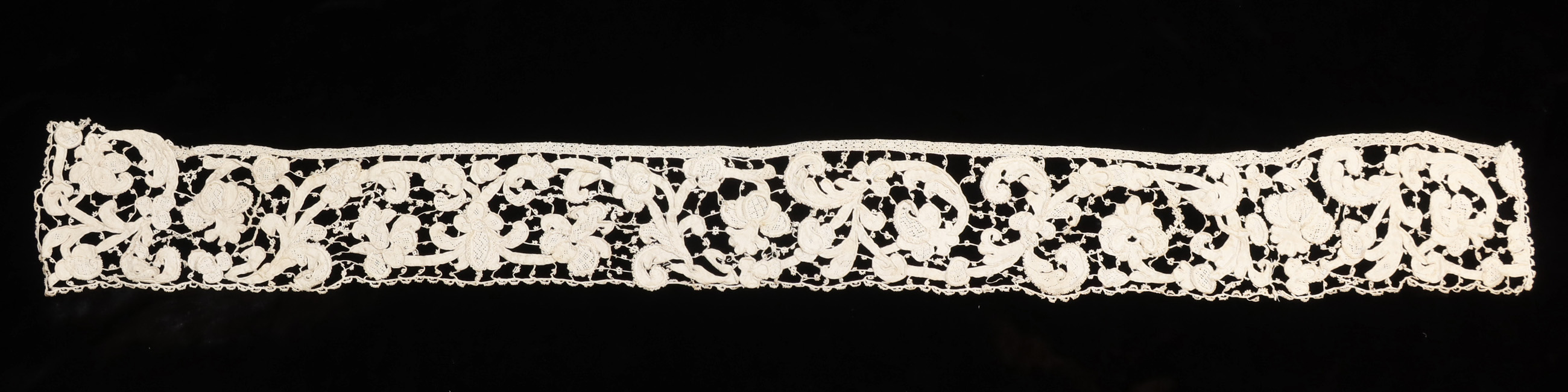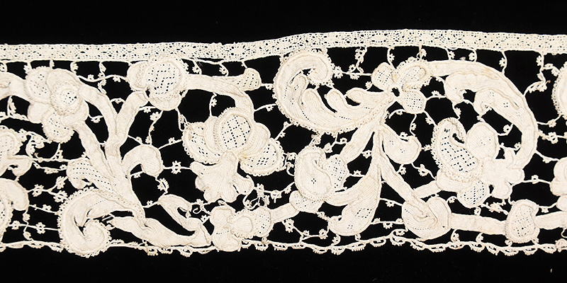 ヴァネチアンレース(ポワン・ド・ヴニーズ)の中でも立体的なグロ・ポワンのボーダーです。唐草とザクロを思わせる模様で、詰め物をした立体的なブロッド(糸の束)によるダイナミックな表現とトワル部分のぎっしりと密度の高い細工、緻密なブランケットステッチで覆われたブリッド(つなぎ糸)も特徴になっています。ブロッドの周囲に付けられたピコットは限りなく繊細。裾部分に付けられた半円形が連なった細工も、同じくブランケットステッチで覆われています。