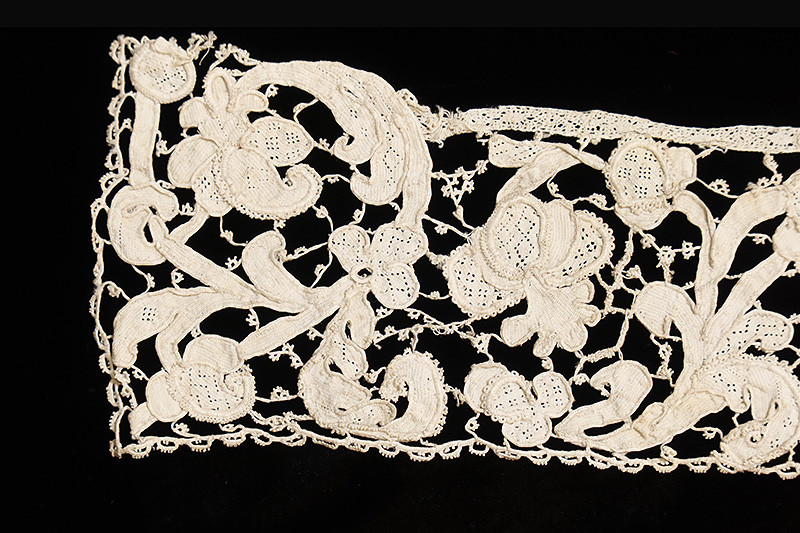 15世紀末から16世紀初頭にイタリアのヴェネチアでニードルポイントレースが考案されました。17世紀になるとプント・イン・アリア(空中レース)が発明され、その後プント・イン・アリアからグロ・ポワンと呼ばれる立体的なレリーフを持つヴェネチアンレースへと発展しました。17世紀中頃、最盛期を迎えたヴェネチアンレースは、ヴェネチア商人の手で北の貿易都市アントウェルペン(アントワープ)を経てパリ、ロンドンなどヨーロッパ中に広まりました。