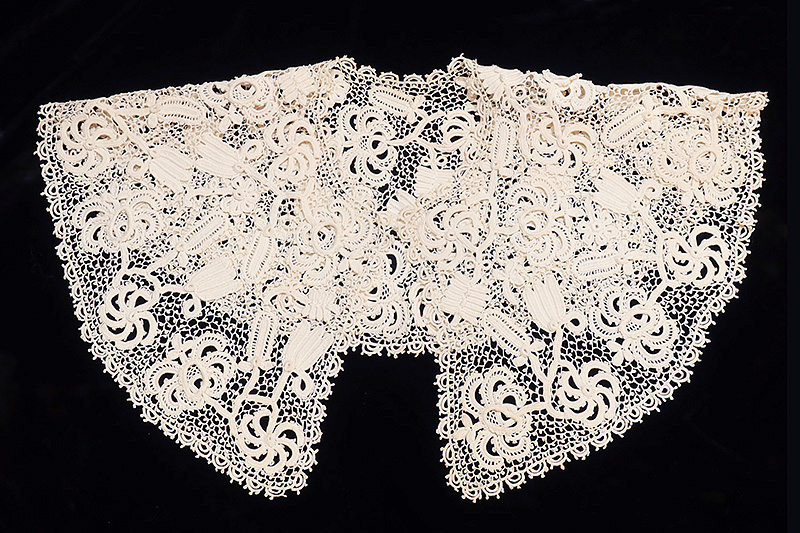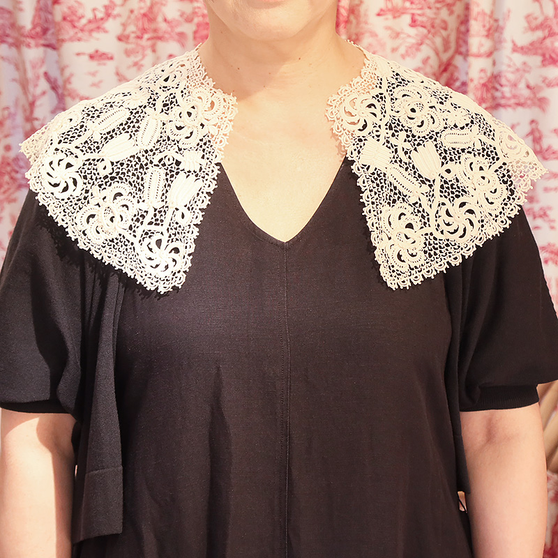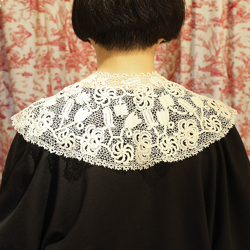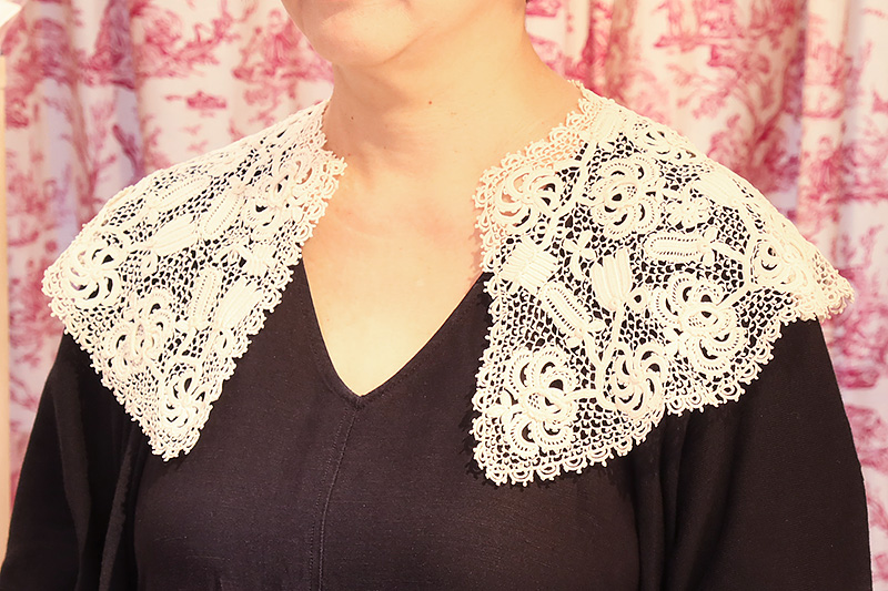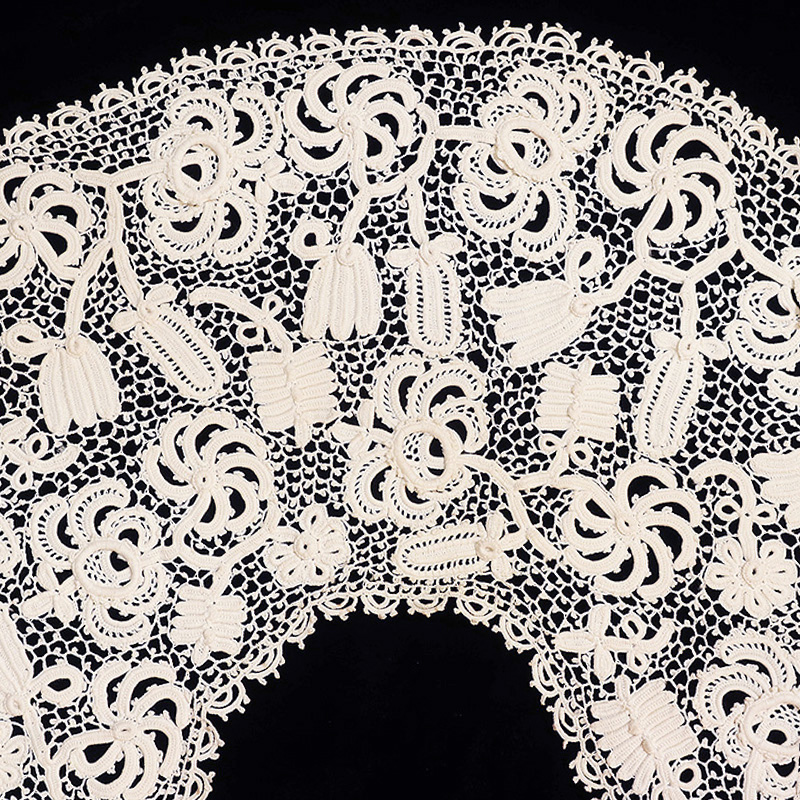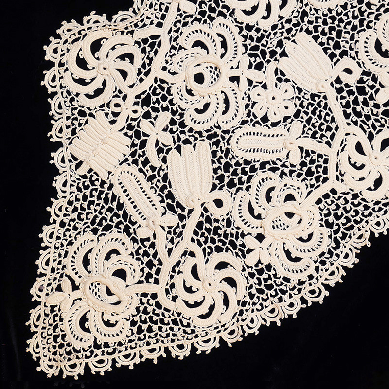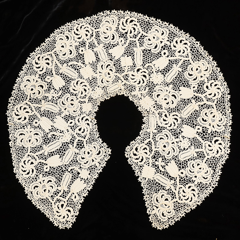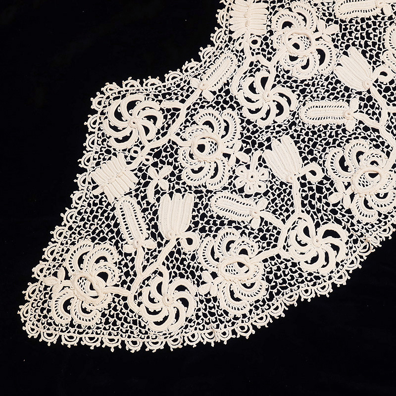様々な立体的な植物モチーフが編み込まれた大変手の込んだアイリッシュクロシェのかぎ針編みの襟です。透かしになったお花模様、その上に付けられたピコットの付いた円形のブロッド(糸の束)の細工がヴェネチアンレースのレリーフを思わせます。また、お花の花芯にも糸で出来たパールが付けられていて、立体的な仕上がりになっています。