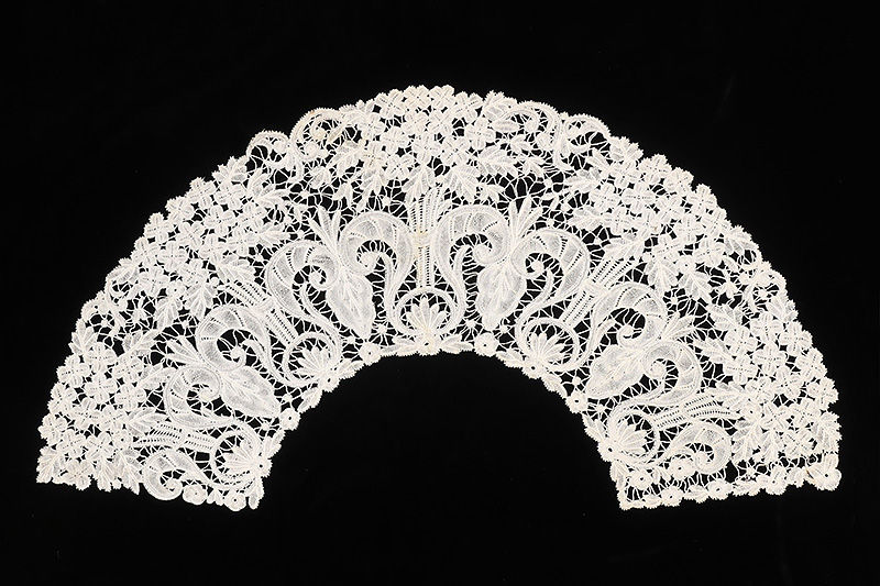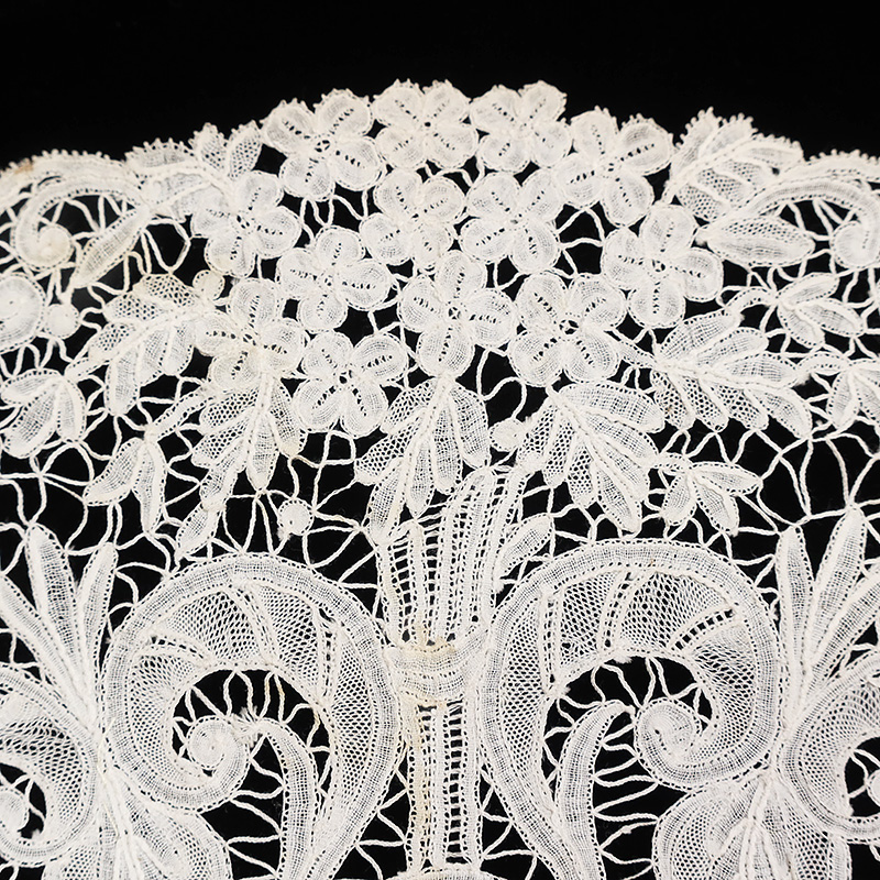 ボビンレースで形作られたお花とロココ模様にはギンプ(アウトラインの細工)が見られ、模様と模様はバー(小枝模様)でつながれています。ファンの骨は失われていますが、特にボビンレースがお好きな方にはおすすめ。大変良好な状態です。
