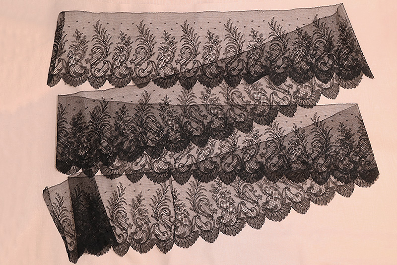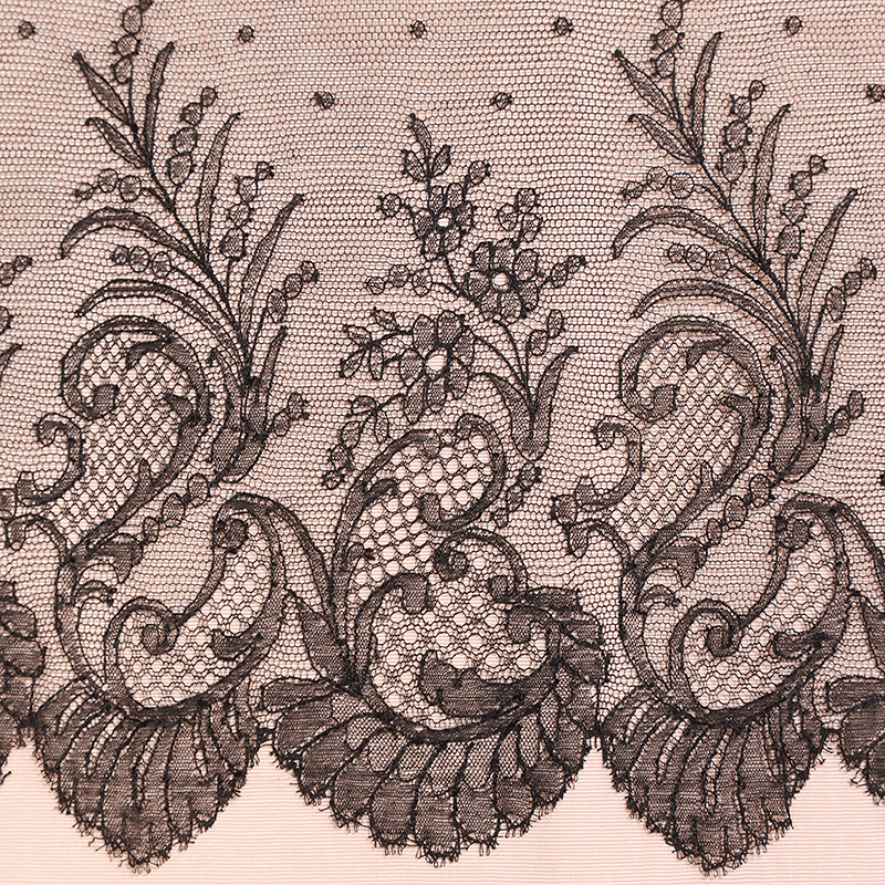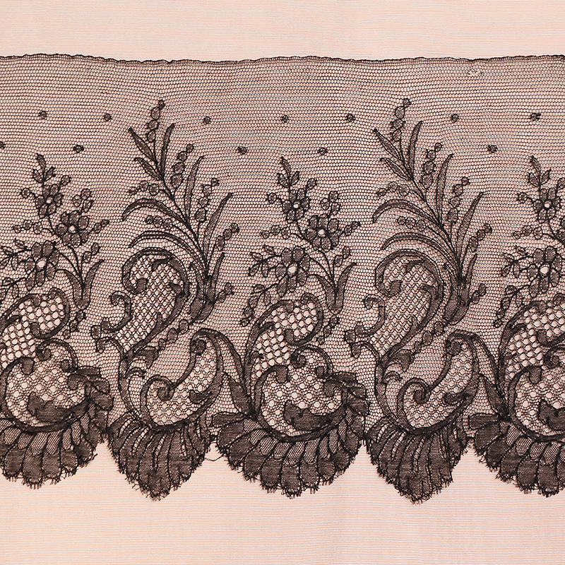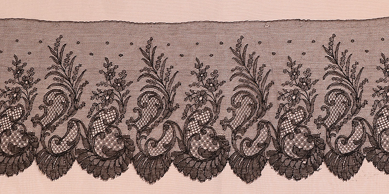 シャンティイレースは17世紀半ばパリの北イル・ド・フランスのシャンティイで生まれた黒絹のボビン・レースです。18世紀後期にはルイ15世の愛人だったデュバリー夫人やマリー・アントワネットに愛されましたがフランス革命と共に衰退。ナポレオンの庇護の元19世紀初頭に復活しました。1840年代以降はノルマンディーに生産は移り、カーンやバイユー、そしてベルギーでも同様なレースが作られました。19世紀半ばには、ナポレオン三世の后、スペイン生まれのユージェニーに愛され、当時は華やかな色彩のドレスにシャンティイレースを飾ることが大流行しました。