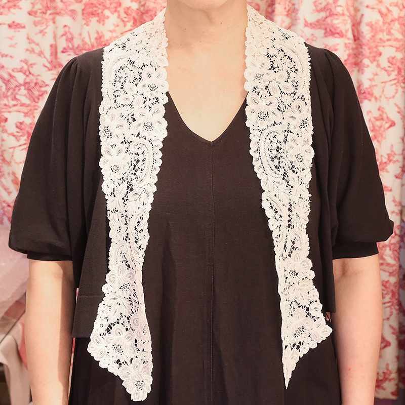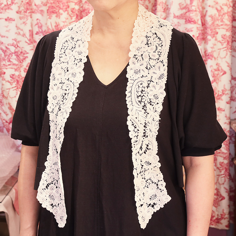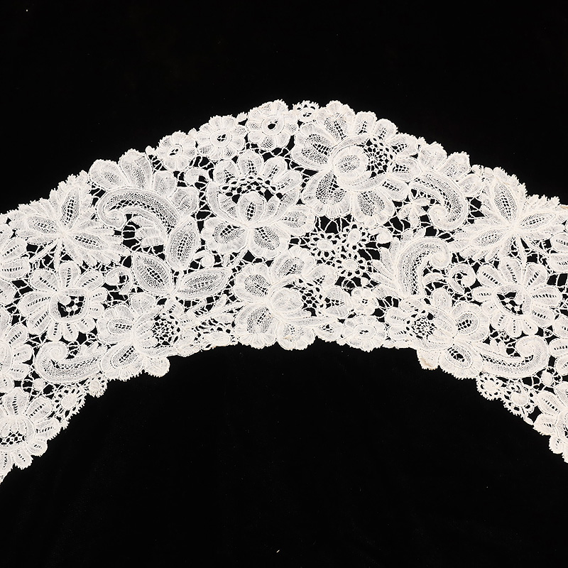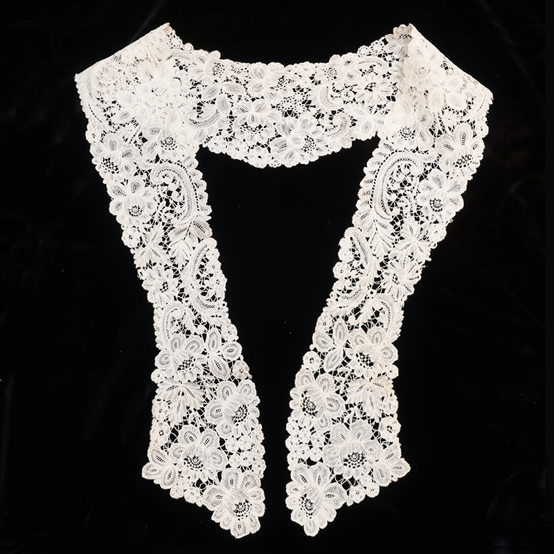 薔薇模様とロココ模様の華麗な組合せ。「豊穣」を表す大振りな薔薇のお花があちらこちらに配されたゴージャスな襟です。薔薇の花芯部分には繊細な透かし細工。大小の薔薇が細工された薔薇づくし、デュシェスならではのはっきりした模様が目を惹きます。