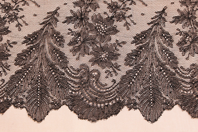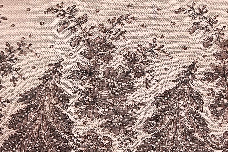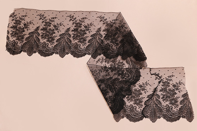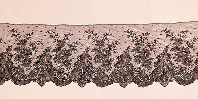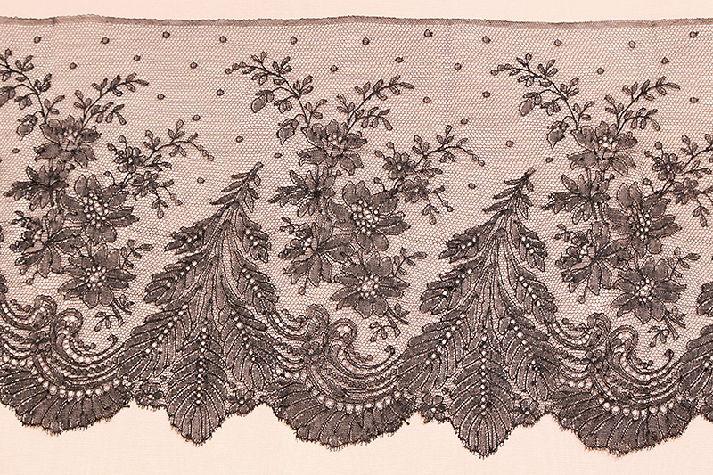 シャンティイレースは17世紀半ばパリの北イル・ド・フランスのシャンティイで生まれた黒絹のボビン・レースです。18世紀後期にはルイ15世の愛人だったデュバリー夫人やマリー・アントワネットに愛されましたがフランス革命と共に衰退。ナポレオンの庇護の元19世紀初頭に復活しました。1840年代以降はノルマンディーに生産は移り、カーンやバイユー、そしてベルギーでも同様なレースが作られました。19世紀半ばには、ナポレオン三世の后、スペイン生まれのユージェニーに愛され、当時は華やかな色彩のドレスにシャンティイレースを飾ることが大流行しました。