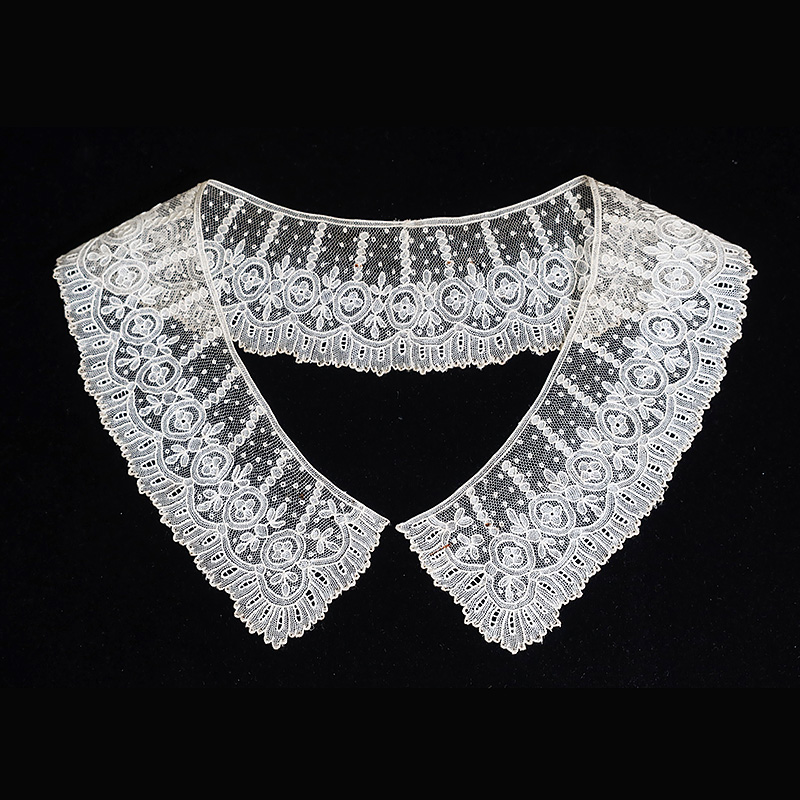 ぐるりと連なるオーバルの中にお花の細工、小さなドット模様も愛らしく、小振りで愛らしい襟です。ポワン・ド・ガーズならではのハンドによるネットの細工が通常のポワン・ド・ガーズに比べてひときわ繊細です。肉眼ではほとんど分からない程度の極小のスポットがありますが、それ以外は大変良好な状態です。