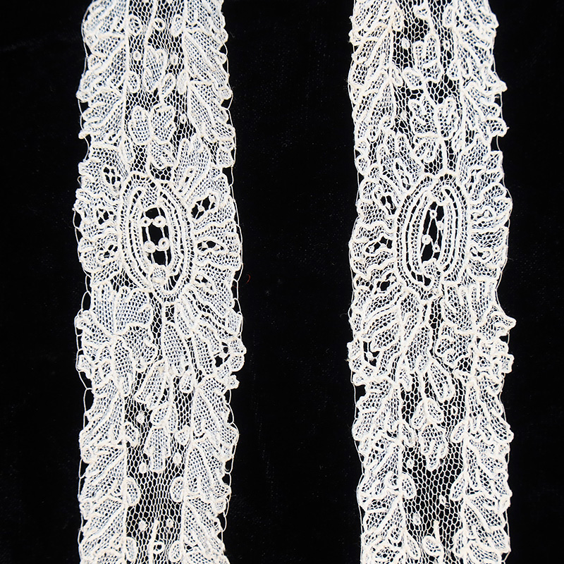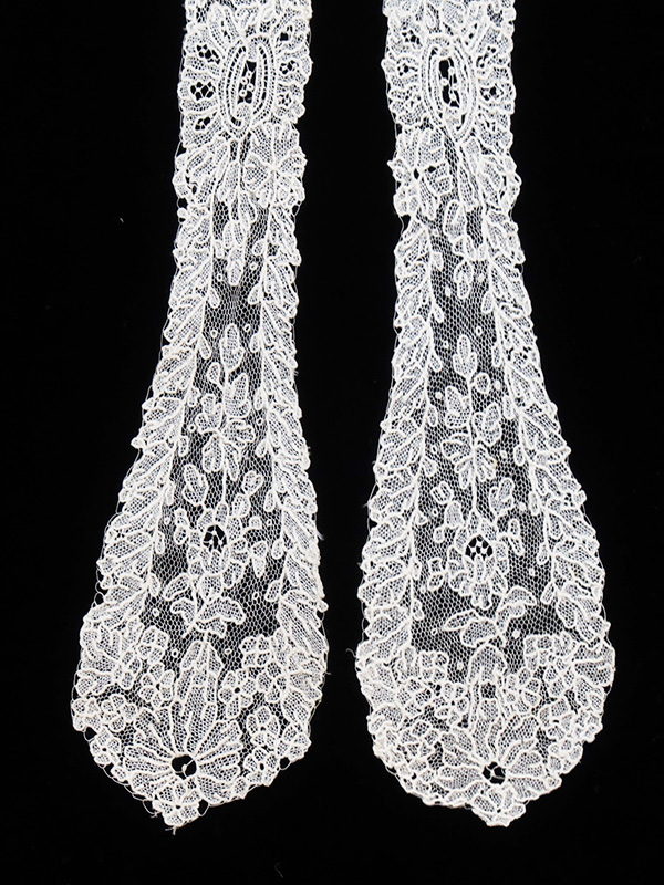 19世紀のベルギーを代表するニードルポイントレース、ポワン・ド・ガーズの小さな愛らしいサイズのラペットです。今まで数々のラペットを扱ってきましたが、このようなサイズのものは、今まで目にしたことがありません。両端に薔薇のお花、リボン状になった部分にはニードルの透かしの細工も見られます。
