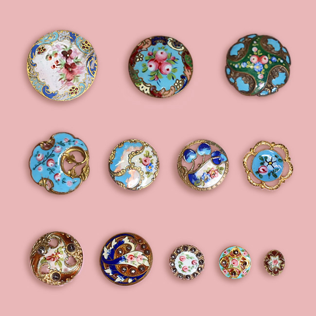 ひとつひとつハンドペイントで絵付けされた七宝焼きのボタンです。鮮やかな色彩とガラス質の艶やかな質感が特徴。使い方は様々、コレクションにもおすすめのアイテムです。