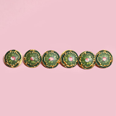 お人形におすすめの小さなサイズ。グリーンの艶無しのマットエナメルに、中央に小さなピンクの薔薇がペイントされた愛らしい上質なエナメルボタン6個のセットです。こうした小さなエナメルボタンがセットで出てくることは稀なこと、大変良好な状態です。