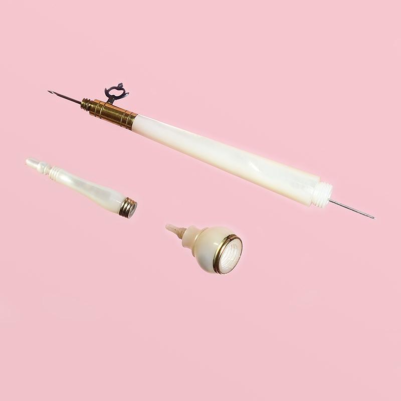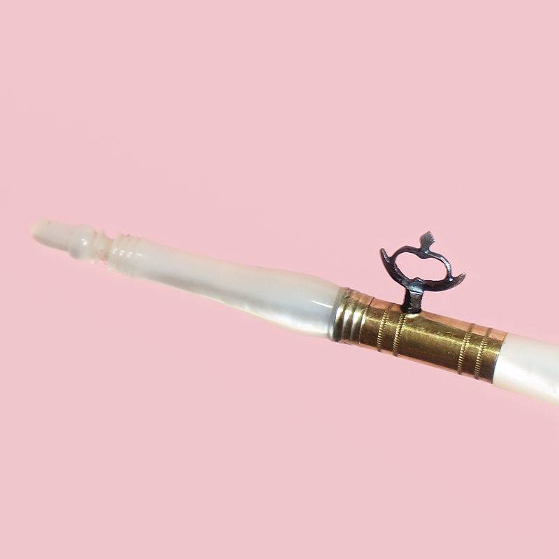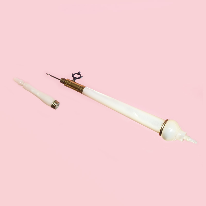 パレ・ロワイヤル製のこうしたアイテムは約200年前の当時のソーイングツールとしては最高峰。同様なタンブールフックの中でも、ひときわクオリティの高いアイテムです。マザーオブパールの光沢のある質感が魅力的で上品な雰囲気、当時の貴婦人の優雅なお裁縫のひとときが伝わってくるようなソーイングツールのひとつです。十分に実用していただける大変良好な状態です。