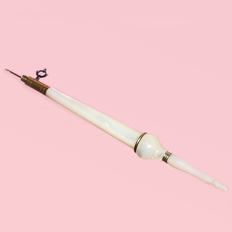最近はリュネビル刺繍などでもよく知られるようになった繊細なかぎ針、パレロワイヤル製の美しいマザーオブパールのタンブールフックです。ジョイント部分は金張りの金属、キャップ、後ろ側の針を入れる部分とも同じく金張りの金属でトリミングされており、マザーオブパールに精巧なネジが切られています。先端には既にかぎ針が付いていますが、ハンドルの先端の針を入れる部分には、さらにもう1本替えの鍛鉄製かぎ針1本が入っています。(替え針は失われていることも多いので、1本でも残っているのは珍しいことです。)かぎ針はその都度ネジで本体に装着する仕様で、繊細な替え針を持っていらっしゃる方はこちらに装着してお使いいただくことが出来ます。