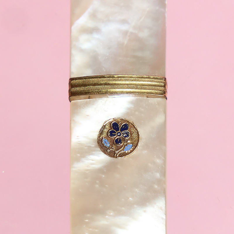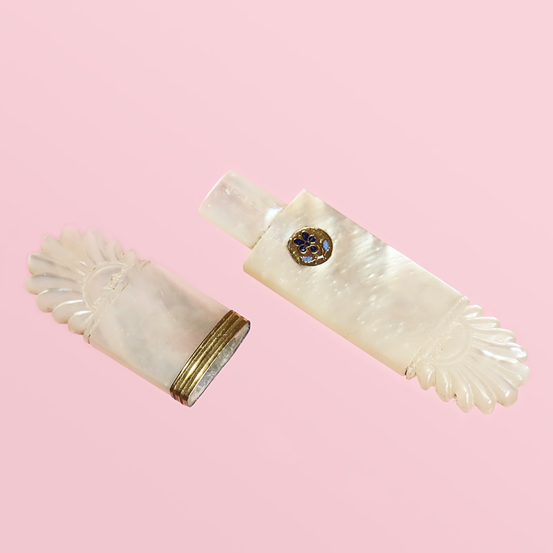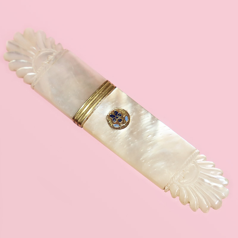 両端に手彫り彫刻を施した、光沢の美しいマザーオブパールの素材感が際立つパレロワイヤル製のニードルケースです。イエローゴールド製のフレームをジョイント、表側にはパレロワイヤルの証エナメル製のスミレの紋章が付けられています。(付いていない物もあります。)