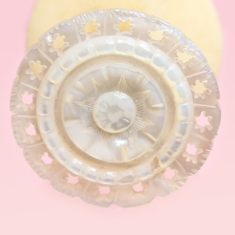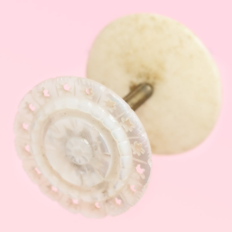 トップは光沢の美しいマザーオブパールに立体的な手彫り彫刻、縁には繊細な透かしの細工がぐるりと施された美しいコットンリールです。上下二つに分かれることができ、ボビンや糸巻をサンドして飾るためのアイテムです。底の部分はプレーンなボーンになっています。