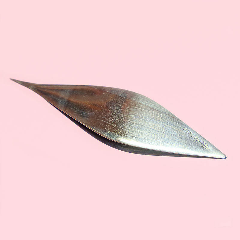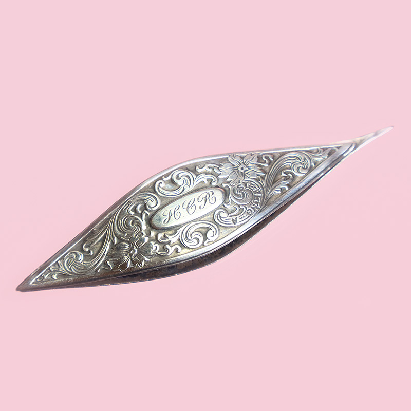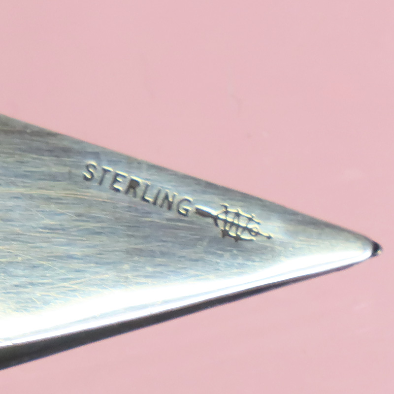 “STERLING”の文字が、中央には持ち主の愛称だったのでしょうか“HCR”の流麗なイニシャル文字が手彫りで刻まれています。裏面はプレーンな形状です。実際にお使いいただくことも出来る大変良好な状態です。コレクションにも実用にもおすすめの一点です。