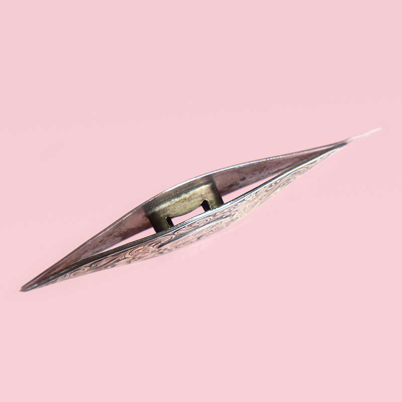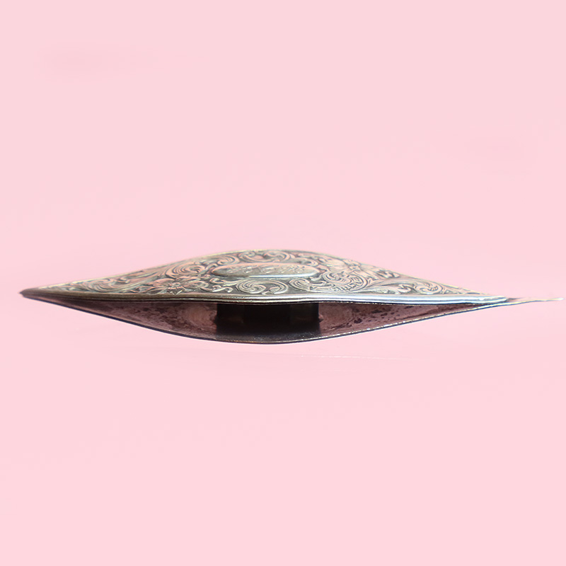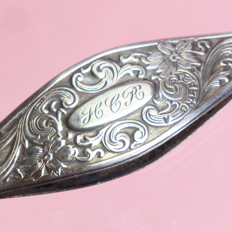 シルバーの素材感も魅力、表面はロココ模様とデイジーのお花が組み合わされた装飾的で華やかな図柄で、ロココ模様に沿って「スターリングシルバー」を表す