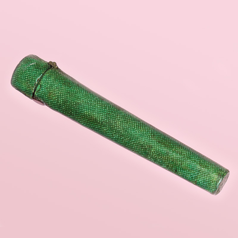 美しいグリーンのシャグラン革装(シャグランは鮫肌のように細かいシボが揃った加工の山羊革のこと。高級な書籍の装丁などに使われるような素材です。)のケースに入ったディエップ製と思われる繊細な彫刻のニードルケースです。緻密なネジを細工したふたは実際に開閉することが出来る、小さなニードルケースです。