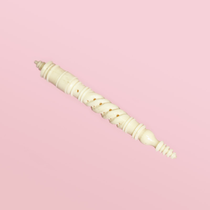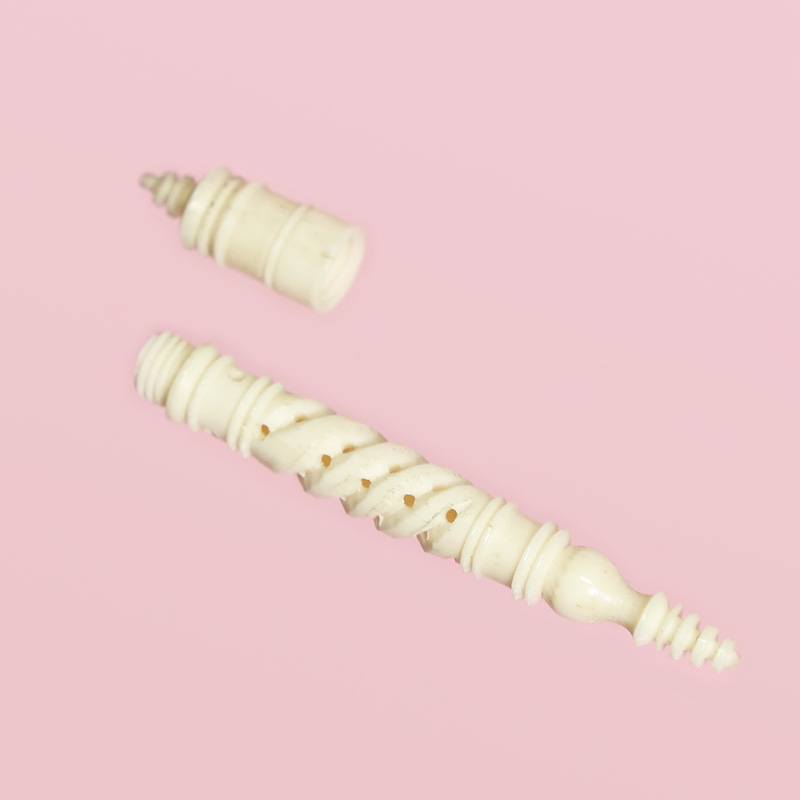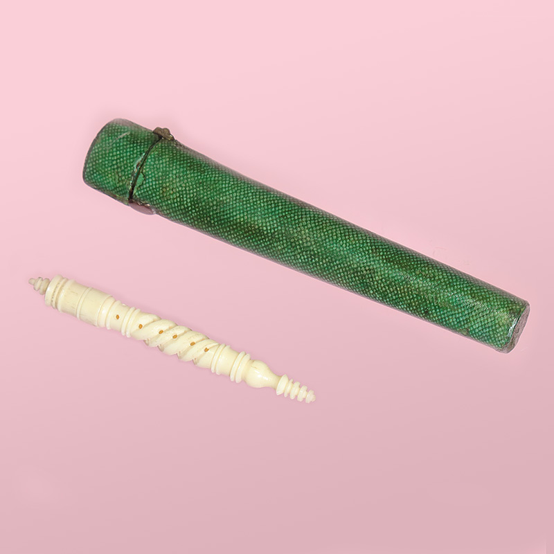 らせん状に彫刻され、点々と開けられた小さな穴からは中の針を見ることも出来ます。ここまでの彫刻を施したニードルケースは、今まで目にしたことがありません。また、「ケース」なのに、専用の皮革製ケースが付属しているものも今回初めて目にしました。ある意味、ニードルケースの最高峰かもしれません。大変良好な状態、実際に針を入れることも出来る実用可能なお裁縫道具です。