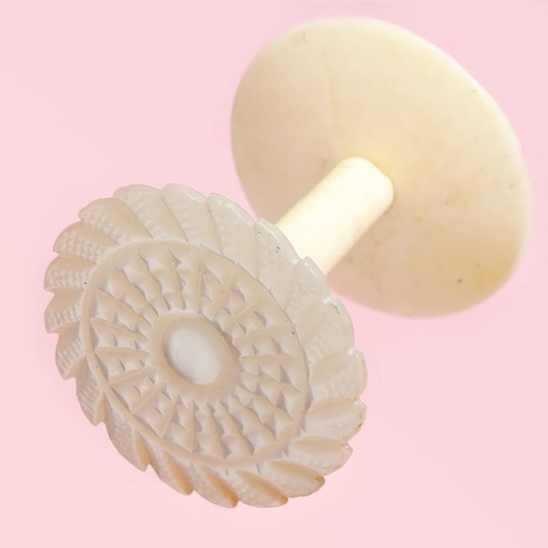トップは光沢の美しいマザーオブパールに幾何学模様の手彫り彫刻、更にその縁にエンジンターンを思わせる放射状のごく繊細な彫刻が施された美しいコットンリールです。芯はボーンで、両端には繊細なネジが切ってあり、上下とも外すことが出来る仕組み、糸巻をサンドして飾るためのアイテムです。底の部分はプレーンなボーン製です。