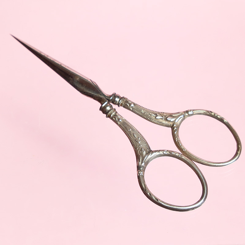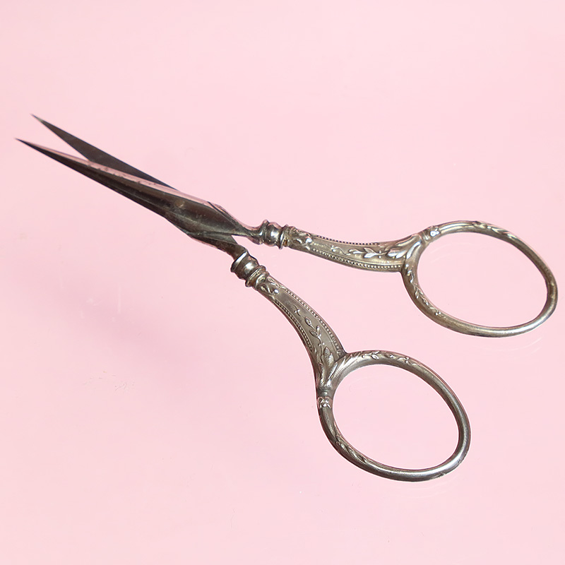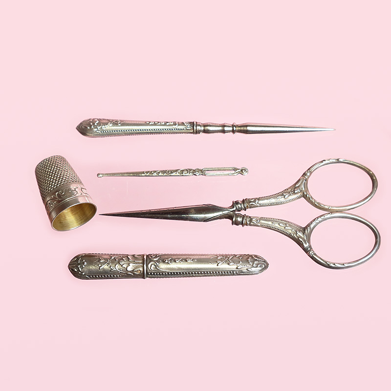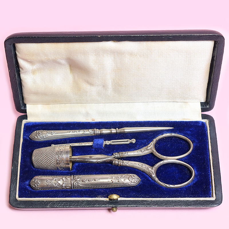はさみとシンブル、めうち、ニードルケース、ひも通しの5点が高級感のある皮革製のケースに入ったソーイングセットです。はさみとめうちのハンドル、ニードルケースはアカンサスを思わせるお揃いの模様、シンブルはお花模様、ひも通しにも繊細な唐草模様が施されています。すべてオリジナルで、コンディションは格別です。
