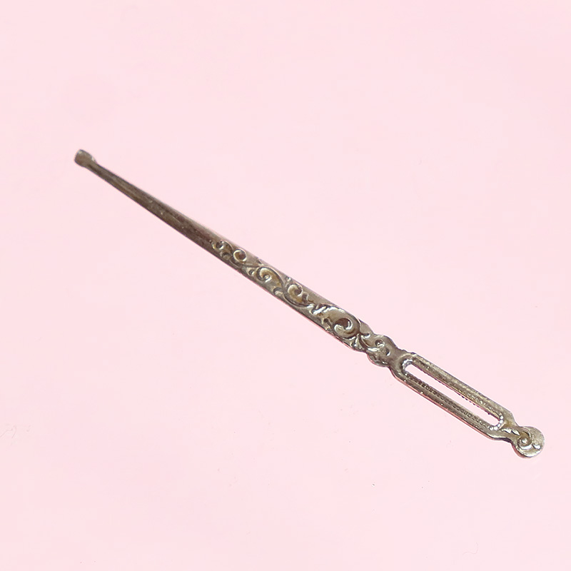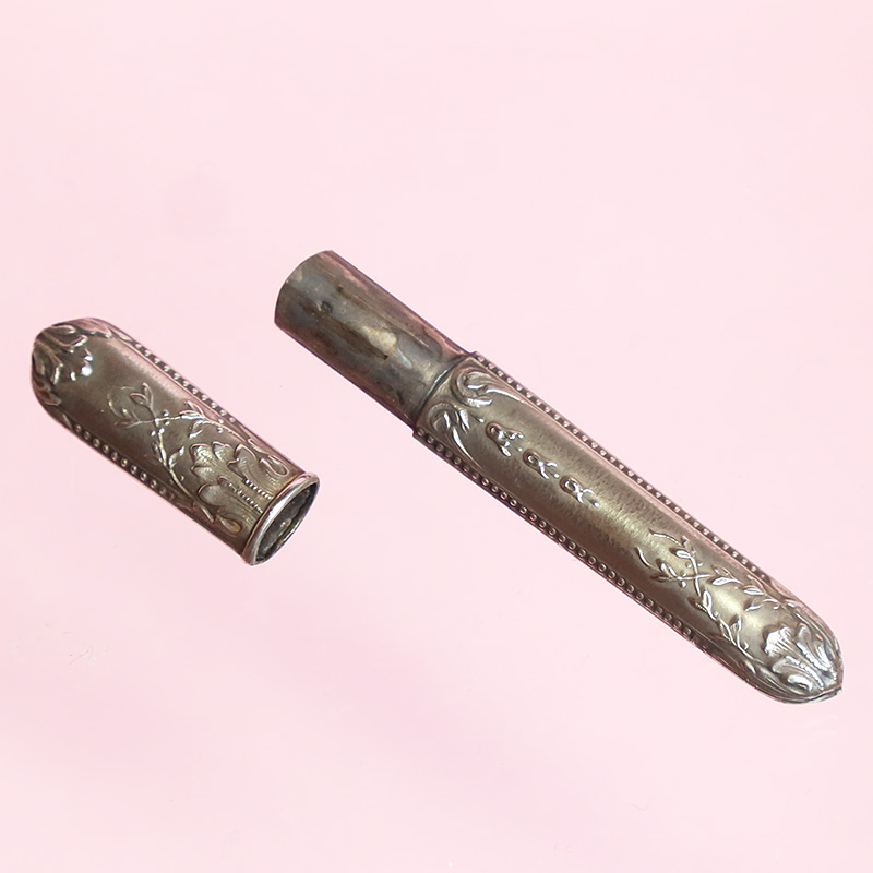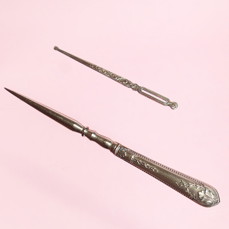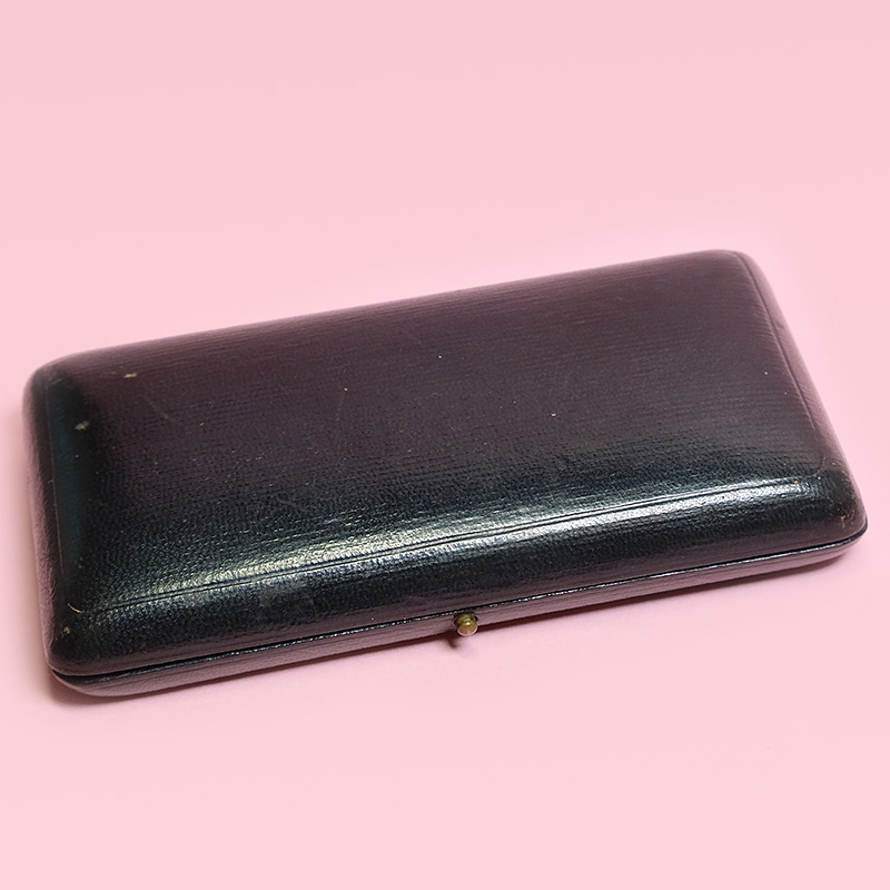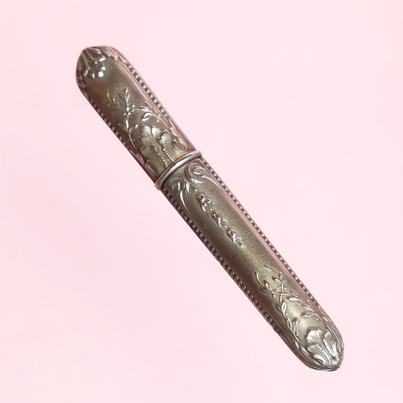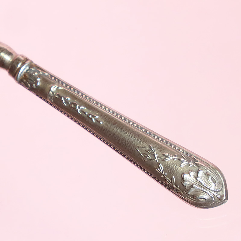 皮革製のボックス、ツール本体とも、これほどの良好な状態で出てくることは昨今希有なことです。繊細な植物模様がエレガントで、コレクションにもおすすめ。ディスプレイしても素敵、使っても楽しい、十分に実用いただけるソーイングツールです。