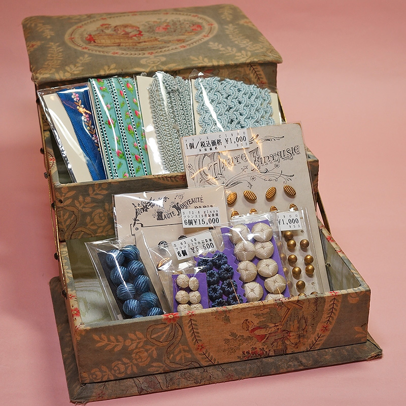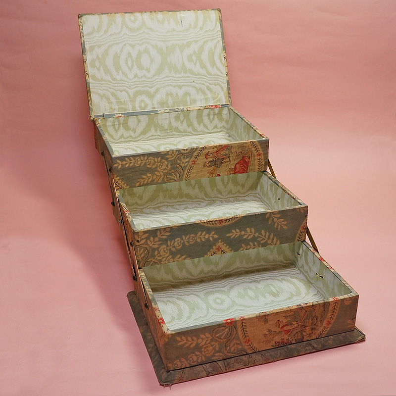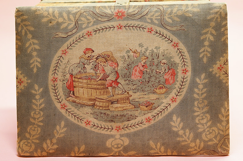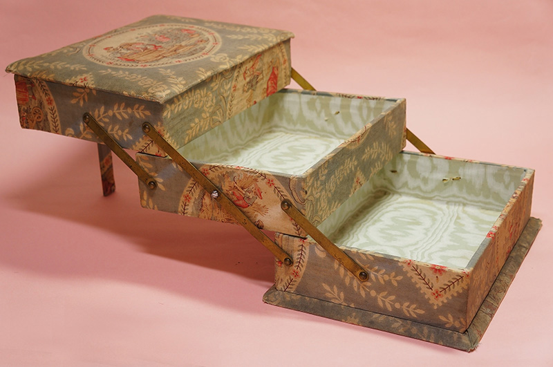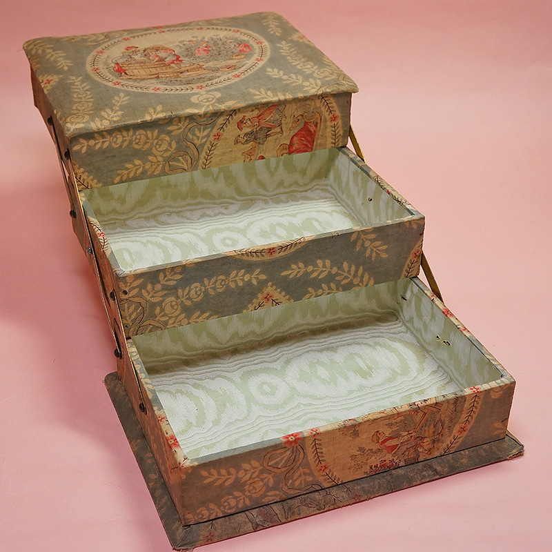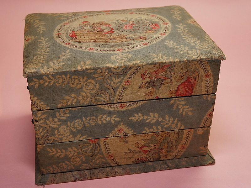 グレイッシュなブルーの地にリボン模様とメダイユ形の中にフランスらしい田園風景の柄、愛らしいフレンチプリントで作られた三段のカルトナージュのソーイングボックスです。内側はブルーグレイのモアレ模様の紙張りになっています。