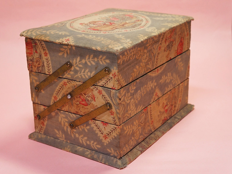 大き過ぎない手頃なサイズですが、三段を階段状に斜めに開ける仕掛けになっている飾り映えのするソーイングボックスで、ソーイングアイテムを入れてディスプレイするのもおすすめです。内側も外側も大変良好な状態です。